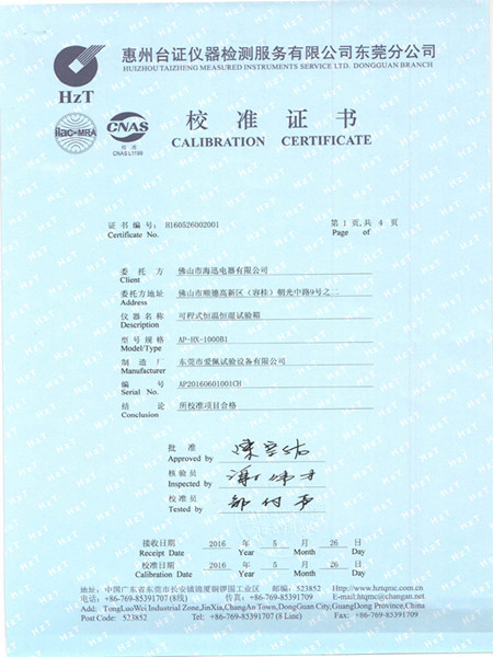 恒溫恒濕試驗箱校準證書